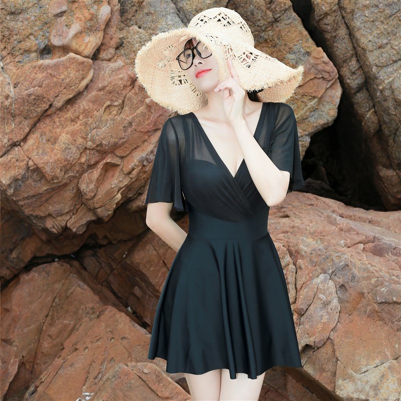新款小胸聚拢泳衣连体裙式女黑色遮肚显瘦保守性感度假泡温泉泳装