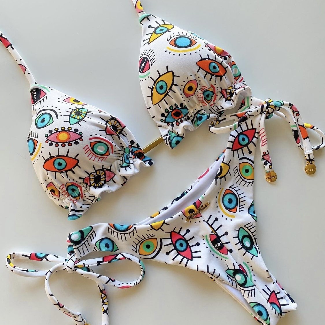 辣妹三点式绑带比基尼两件套时尚ins温泉度假印花小胸聚拢泳衣女