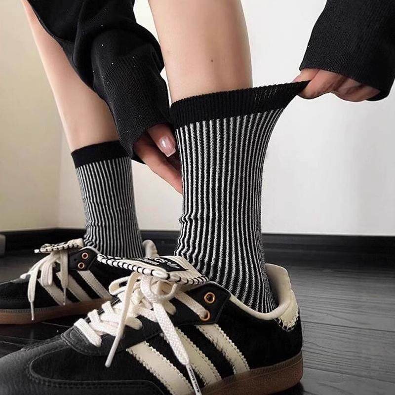 黑色袜子女中筒袜ins潮韩国可爱日系网红款白色短筒春秋长袜条纹