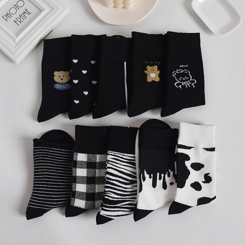 现货韩国女袜东大门街头卡通小熊条纹棋盘格百搭黑色运动中筒袜子