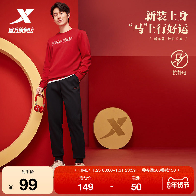 特步新春系列 |加绒卫裤马年长裤冬季男运动裤宽松裤子保暖休闲裤