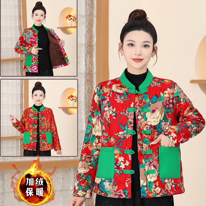 新款秋冬加绒加厚外套女中年妈妈东北大花民族中国风长袖棉衣棉服