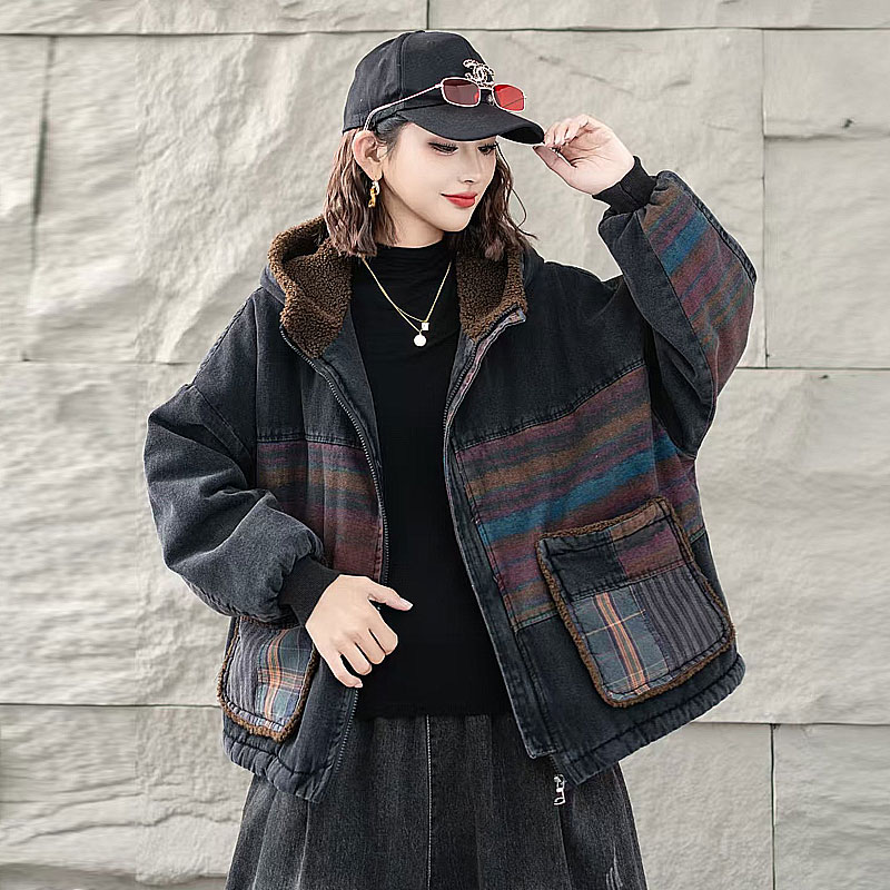 大码女装冬装2024新款宽松文艺复古加绒加厚连帽棉衣牛仔短外套潮