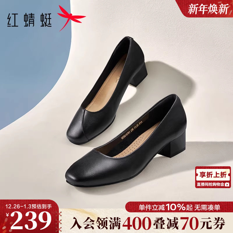 红蜻蜓粗跟单鞋女真皮面试工作女鞋不累脚妈妈高跟鞋黑色职业皮鞋