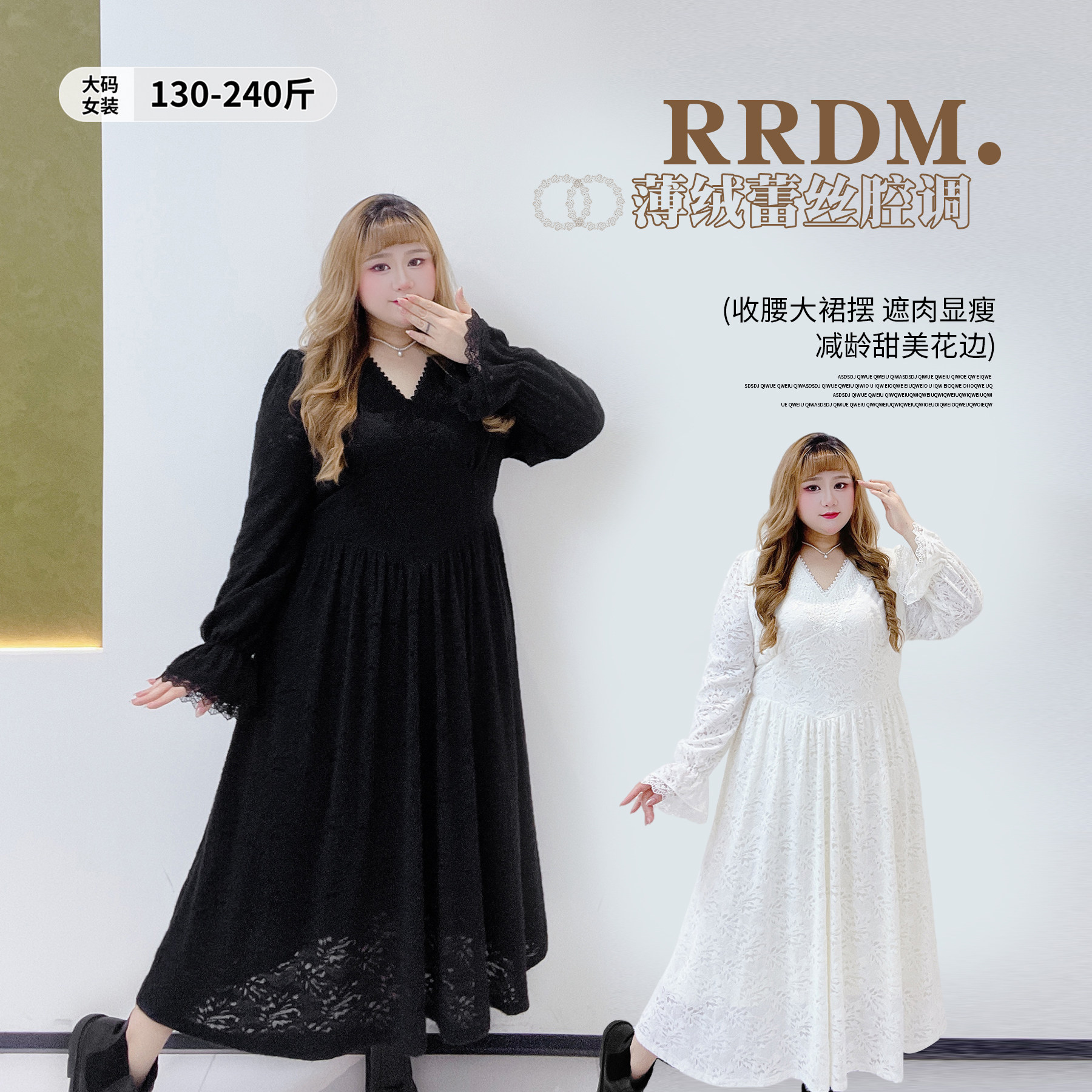 知性风蕾丝花边v领收腰长裙子胖仙女莹莹大码女装秋冬加绒连衣裙