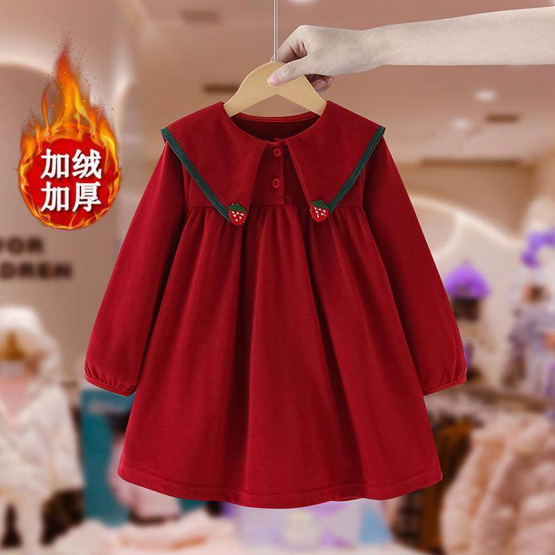 女童加绒加厚年服2025新款中国风新年秋冬加绒连衣裙女孩红色裙子