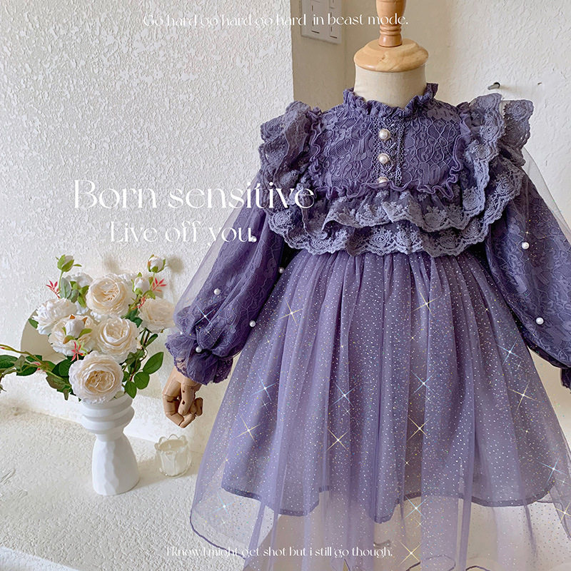 女童紫色秋冬加绒连衣裙2022新款网纱裙洋气宝宝蕾丝公主裙演出服