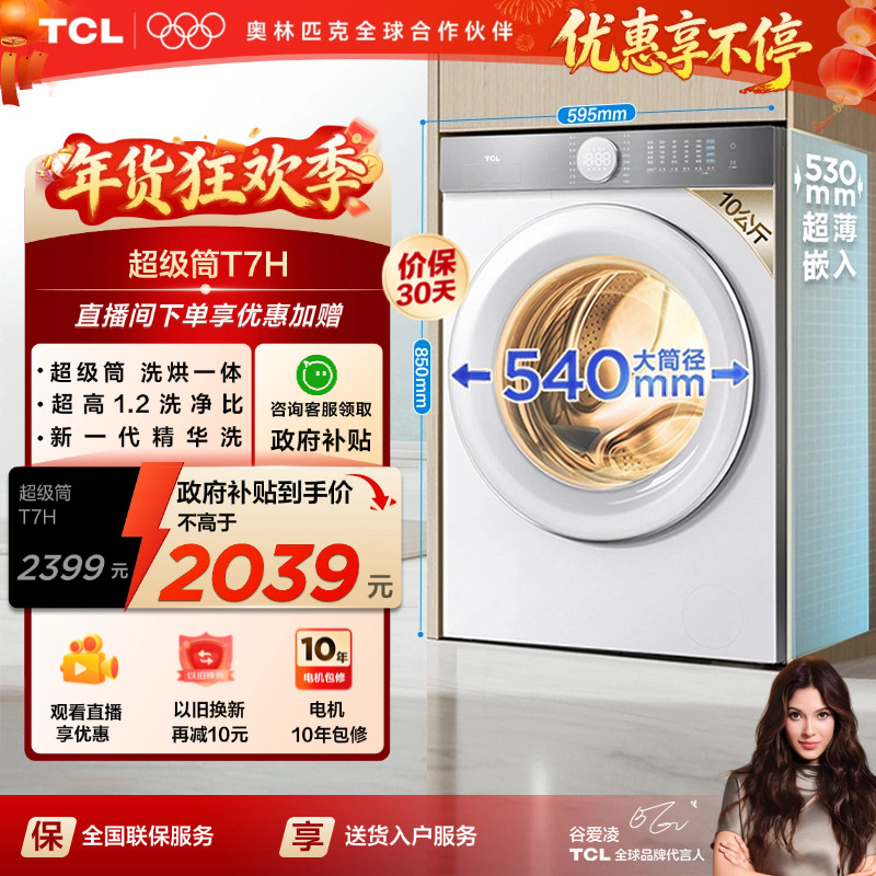 [全民补贴]TCL10公斤超级筒T7H超薄洗烘一体滚筒洗衣机全自动家用