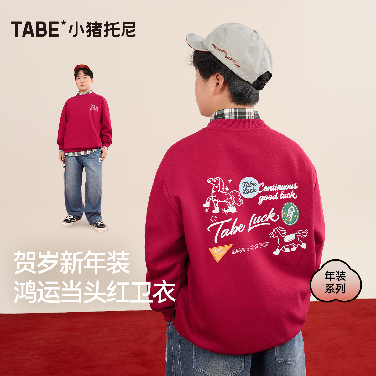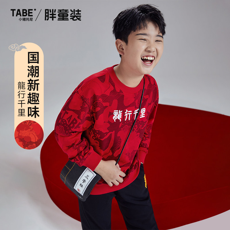 小猪托尼TABE胖男童圆领卫衣加肥加大宽松上衣男孩新年红色童装潮