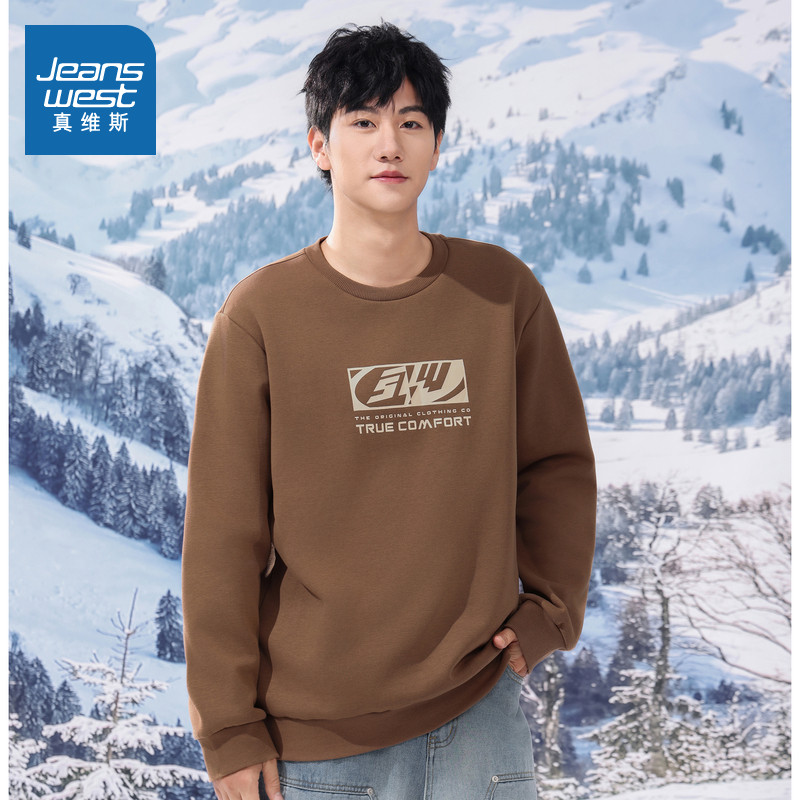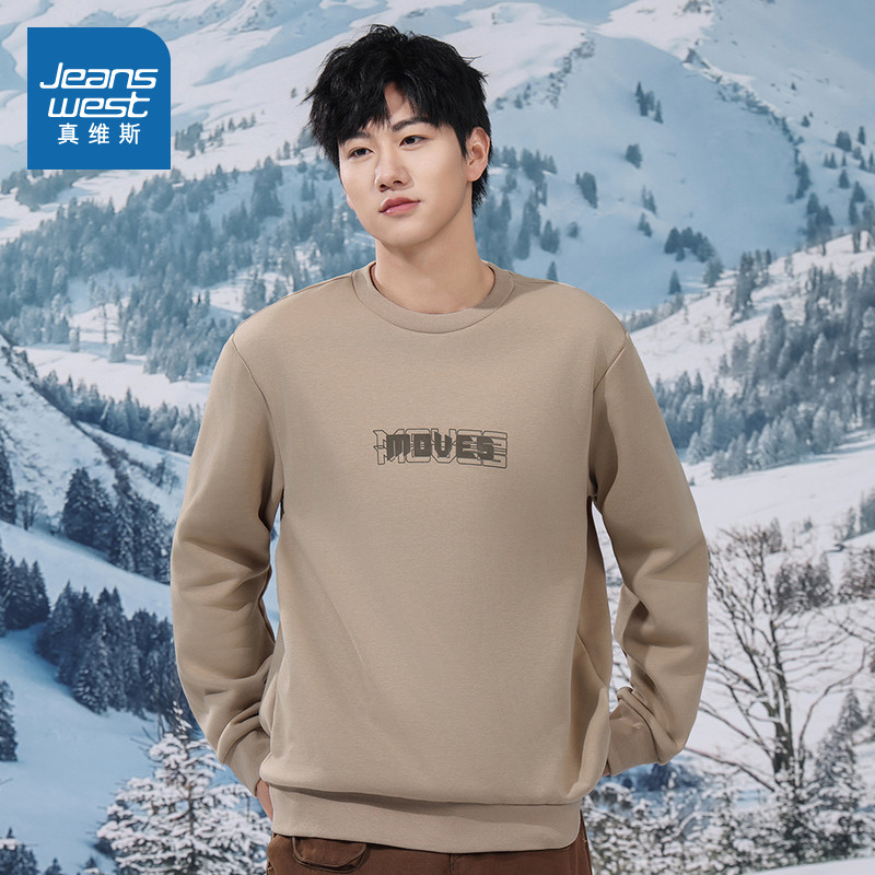 JW真维斯男装加绒卫衣冬季圆领印花男生休闲长袖套头上衣男款衣服