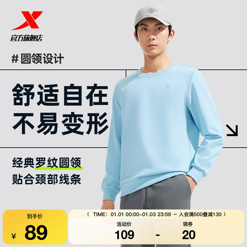 特步卫衣男士冬季新款圆领白色套头衫青少年加绒旗舰运动长袖男装