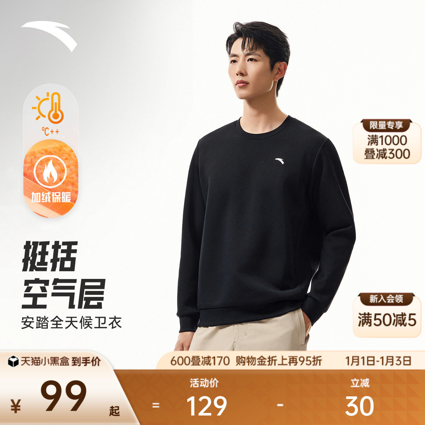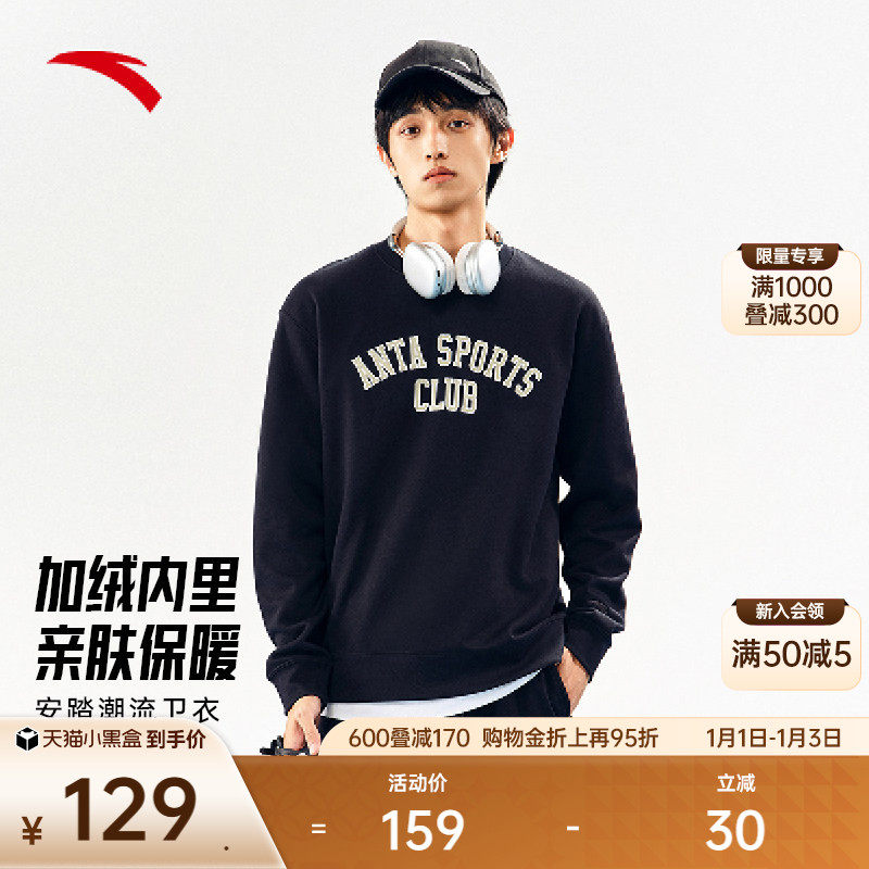 安踏运动卫衣男装2025新款冬季加绒保暖长袖套头衫通勤休闲运动服