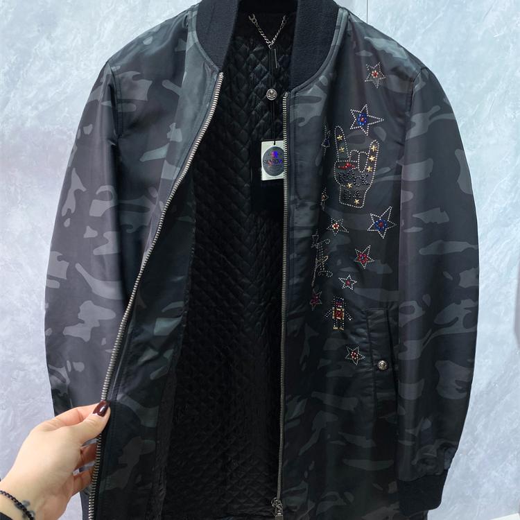 迷彩薄棉休闲风衣烫钻中长款大衣时尚棒球领棉服欧货夹克潮男D60