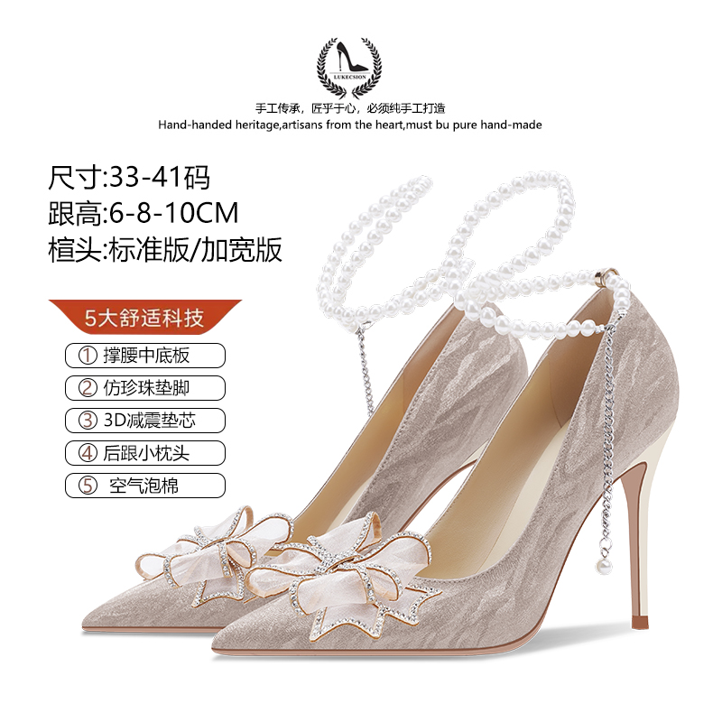 2025春季新款气质尖头蝴蝶结绑带法式单鞋女不累脚名媛宴会高跟鞋