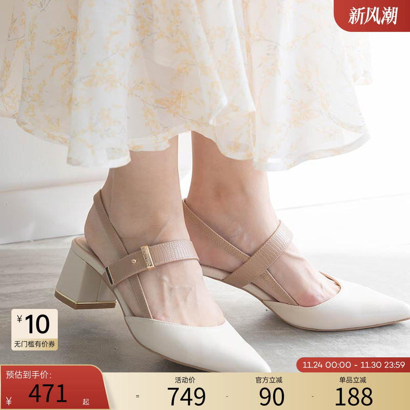 柳钉包头绑带裸色尖头舒适高跟鞋细跟凉鞋女一字扣职业复古单鞋女
