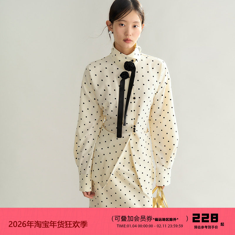 有耳uare原创设计 玫瑰的真心 多穿法波点花朵飘带衬衫半身裙套装