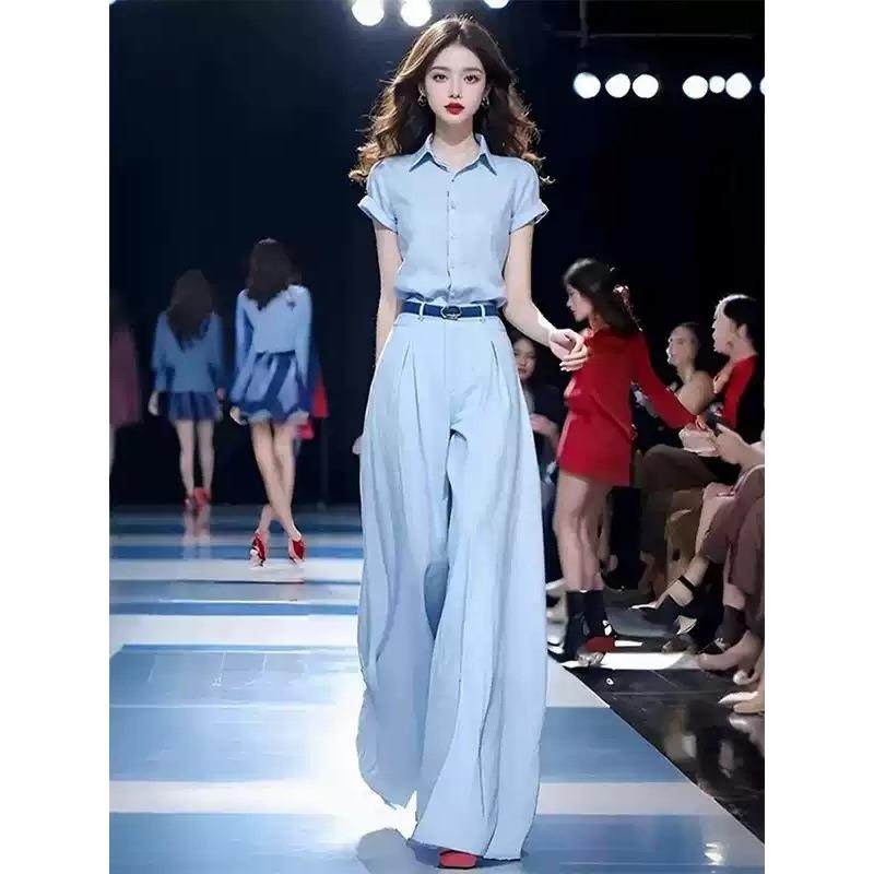 时髦阔高腰气质腿夏季衬衫短袖时尚套装82188洋气女裤新款两件套