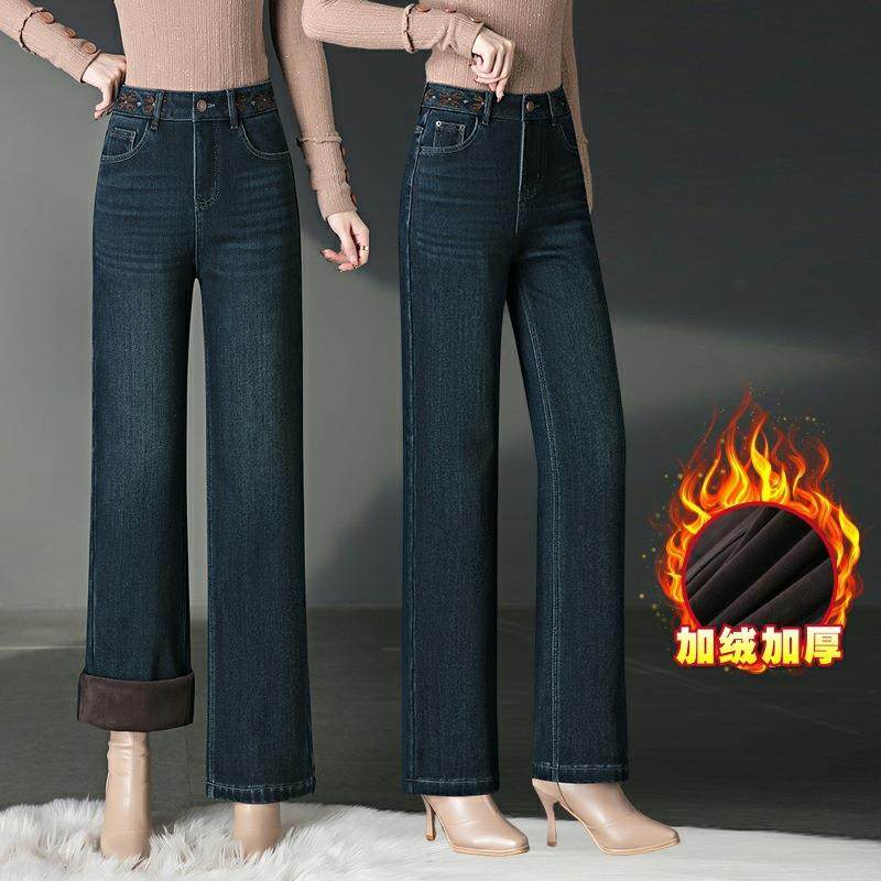 2025冬季新款加绒保暖阔腿牛仔裤黑灰色高腰阔脚裤时尚复古蓝女裤