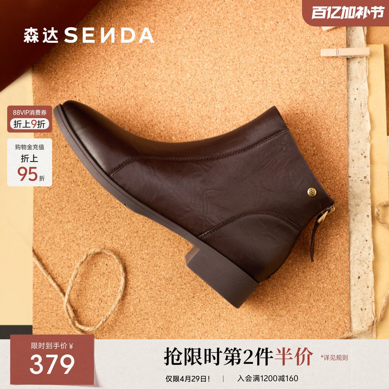 森达羊皮休闲靴女冬季新款商场同款平底粗跟皮鞋4T6B5DD5