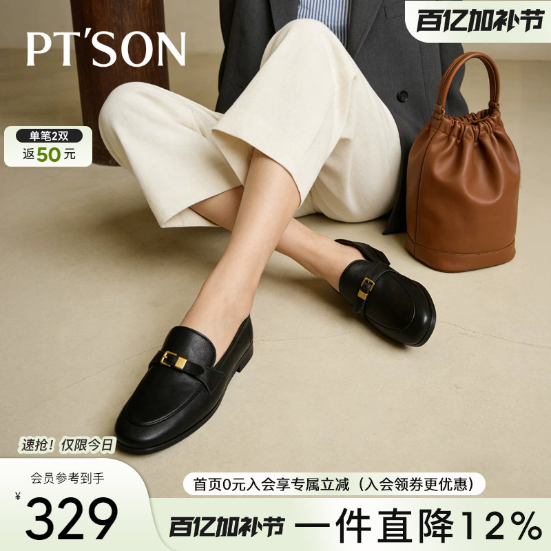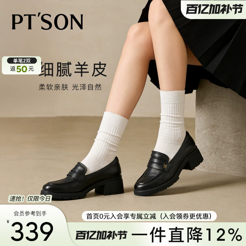 百田森小羊皮乐福鞋女秋冬法式英伦风小皮鞋粗跟方头通勤正装单鞋