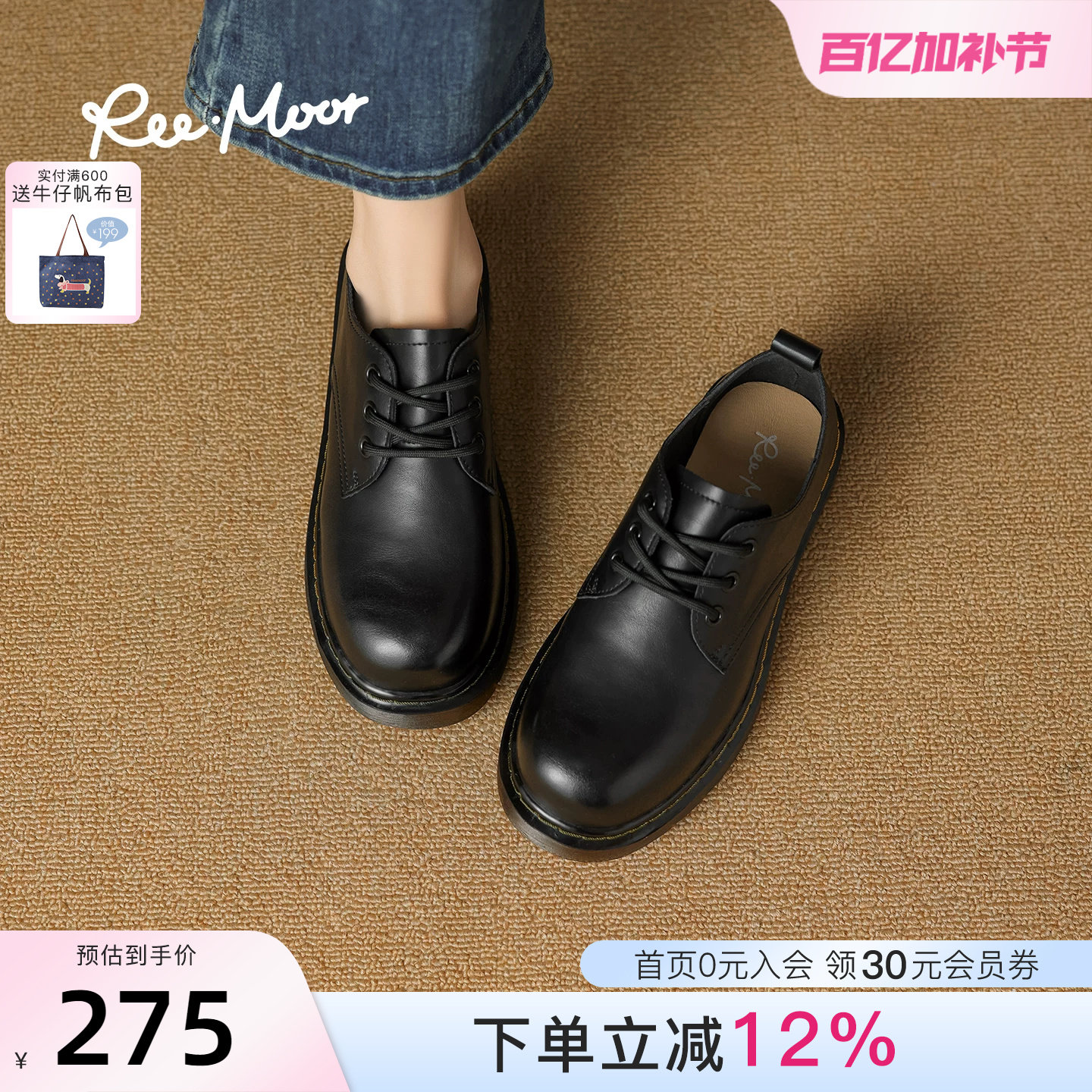 REEMOOR睿慕2025冬季圆头深口单鞋厚底通勤小皮鞋英伦风乐福鞋女