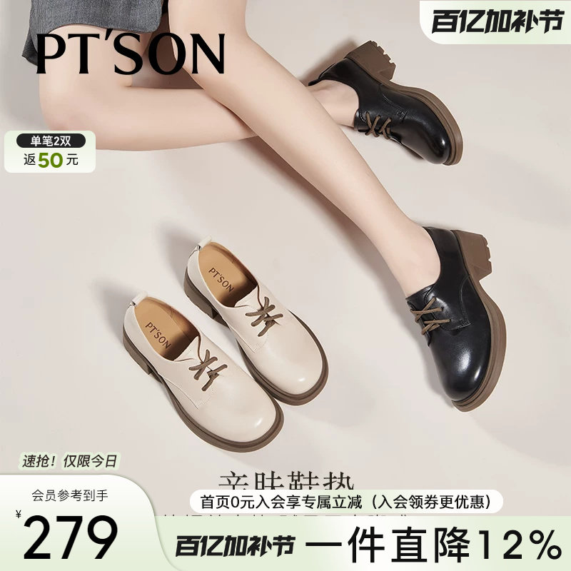 百田森白色乐福鞋女秋冬英伦风系带小皮鞋真皮小个子粗跟深口单鞋