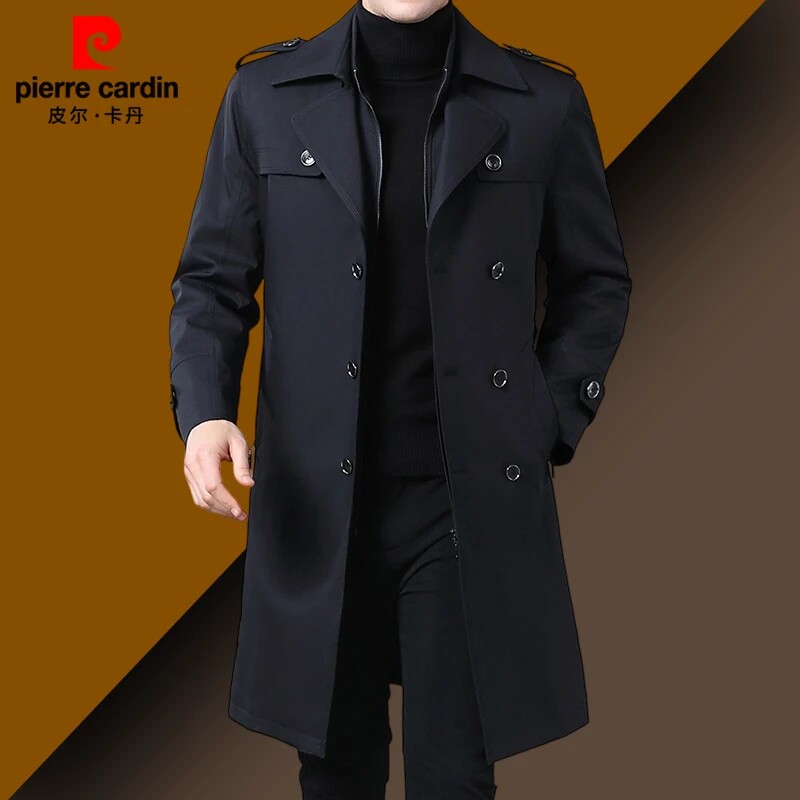皮尔卡丹新款男士风衣外套春秋休闲中年商务时尚翻领中长款双排扣
