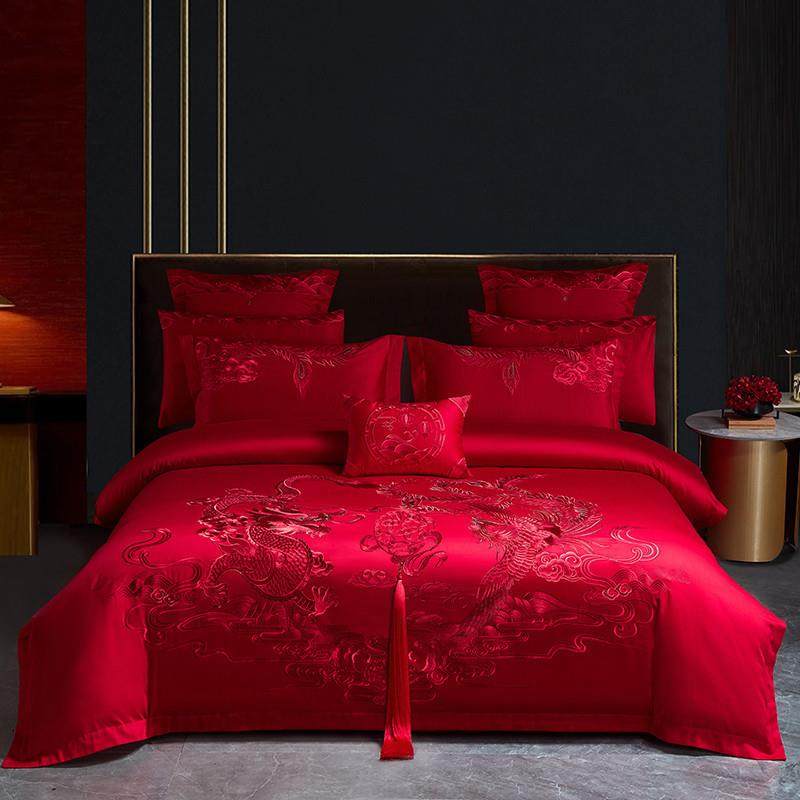 高档龙凤刺绣结婚四件套红色婚房陪嫁被套纯棉婚庆床上用品六件套