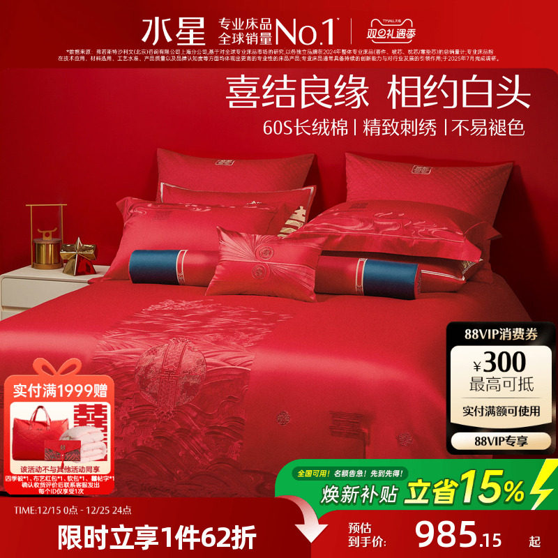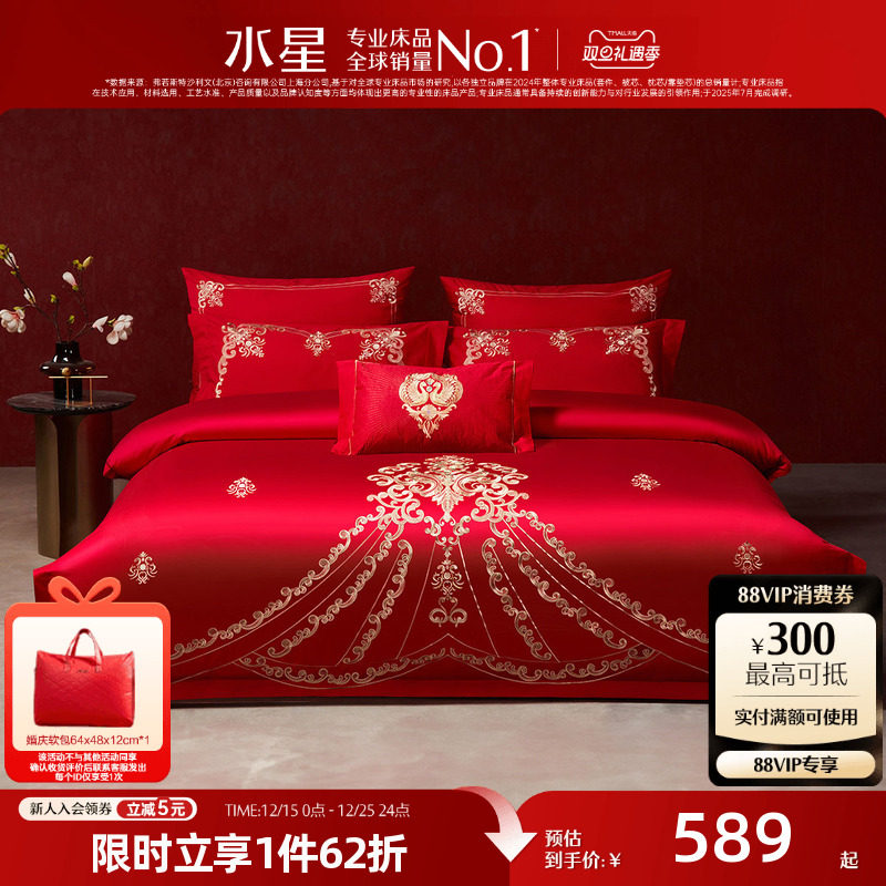 水星家纺婚庆四件套新婚全棉绣花六件套大红喜庆婚嫁套件床上用品