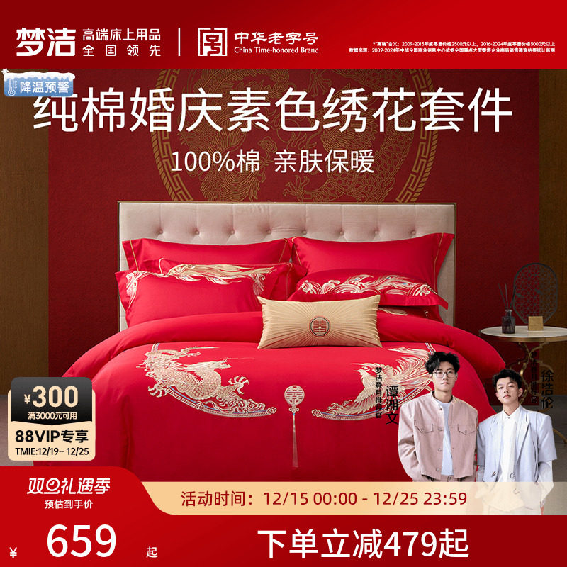 梦洁家纺纯棉婚庆结婚四件套六件套婚嫁红色套件床上用品喜被组合