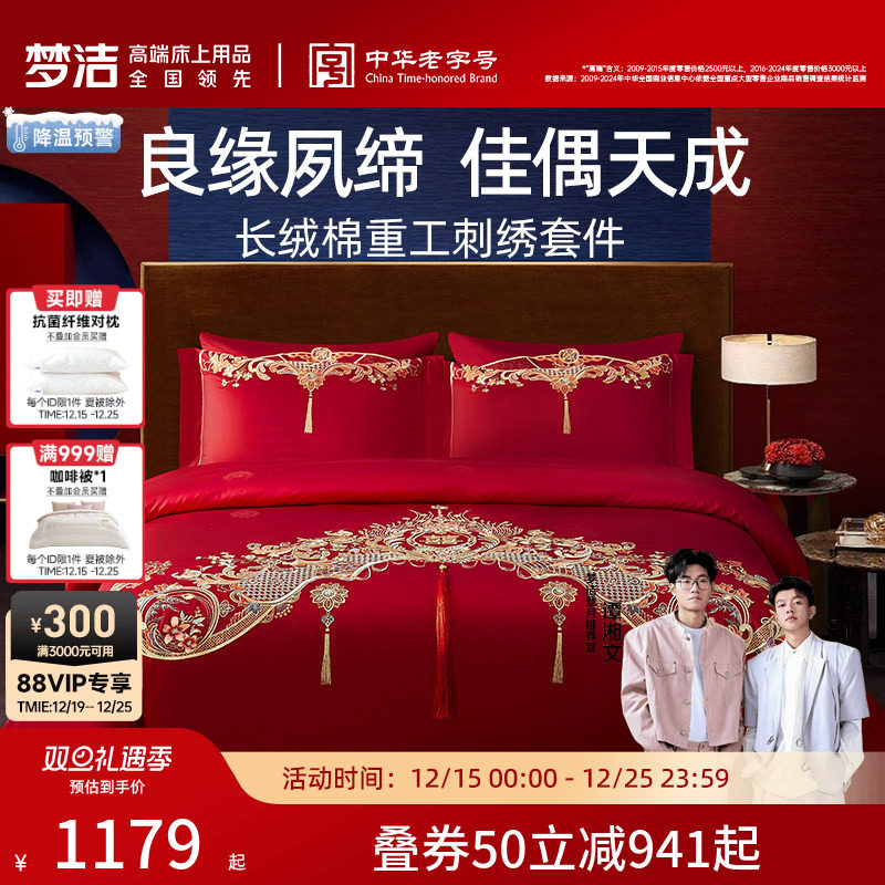 梦洁家纺婚庆四件六件套长绒棉提花绣花结婚套件喜被婚嫁床上用品