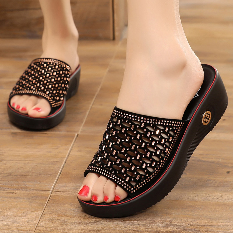 夏季凉拖鞋女水钻妈妈拖鞋厚底中跟坡跟防滑软底中老年皮拖鞋外穿