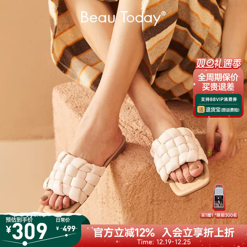 BeauToday编织拖鞋女夏外穿白色凉拖鞋平底夏季凉拖一字拖鞋方头