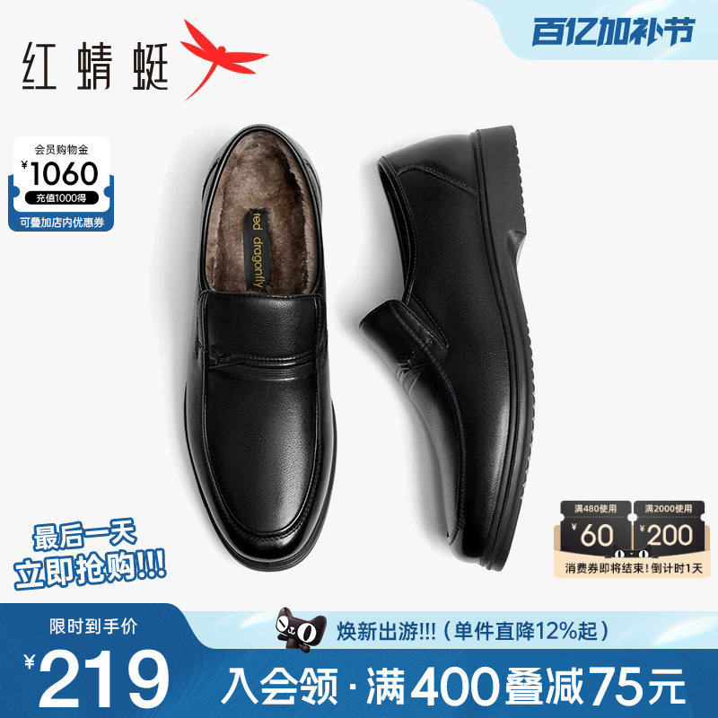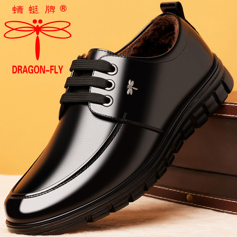 蜻蜓牌男鞋正品加绒真皮牛皮透气休闲皮鞋正装商务中老年爸爸棉鞋