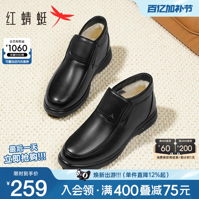 红蜻蜓男鞋冬季新款加绒保暖休闲棉鞋男士真皮中老年爸爸皮鞋男款