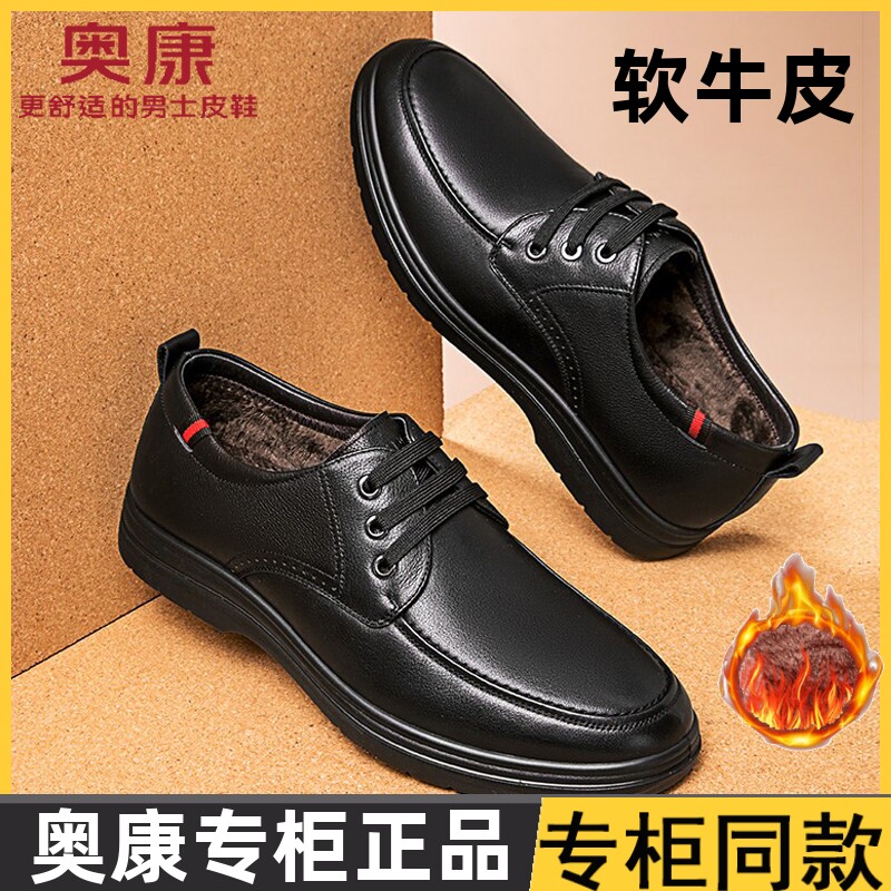 奥康男鞋真皮低帮加绒皮鞋男士休闲鞋冬季系带棉鞋轻便保暖爸爸鞋