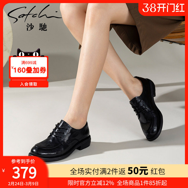 沙驰女鞋低跟平跟系带乐福鞋26年春季新款牛皮深口黑色通勤单鞋女