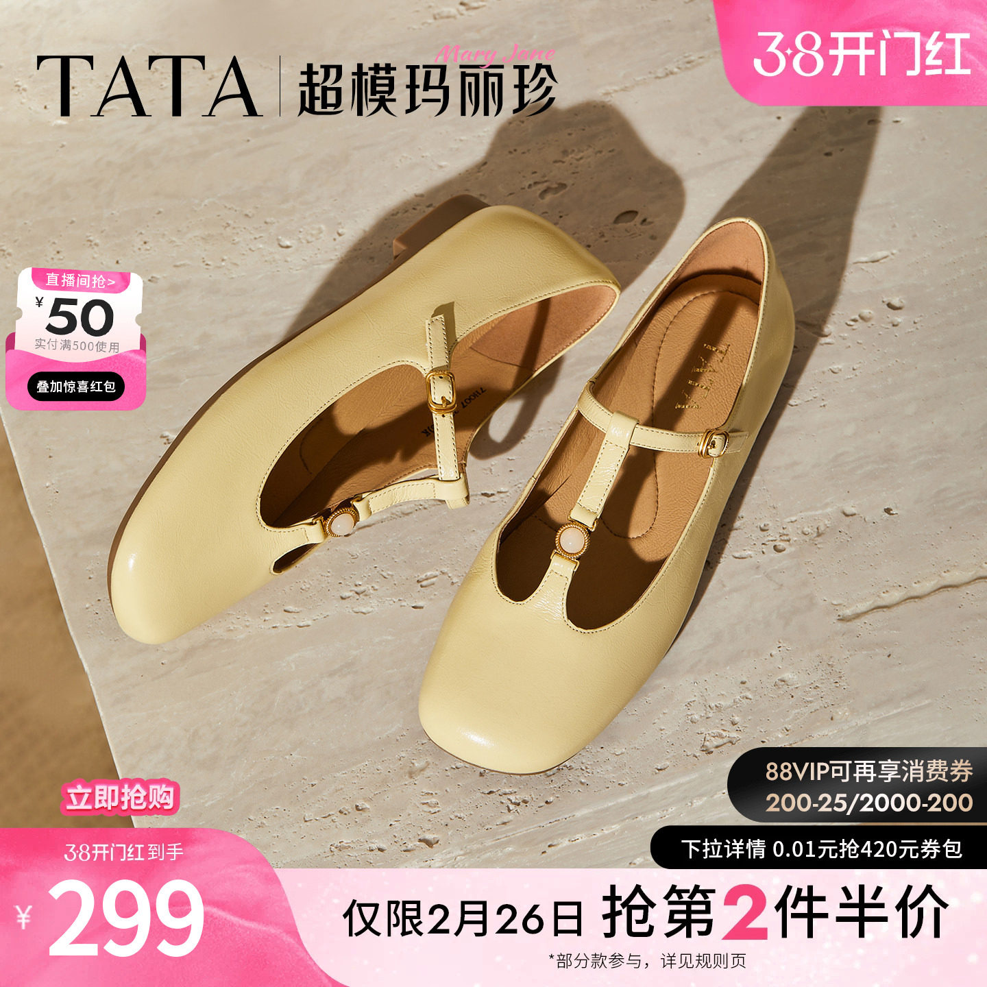 TATA他她女鞋2026春季新款深口鞋真皮圆头女低平跟单鞋子YZU03AA6