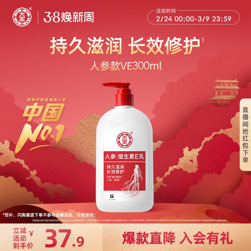 大宝维生素e乳300ml人参精华舒缓修护面霜补水保湿身体乳液旗舰店
