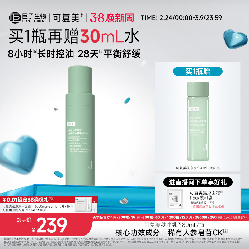 可复美秩序乳稀有人参皂苷致研保湿控油平衡舒缓精华乳液80mL/瓶