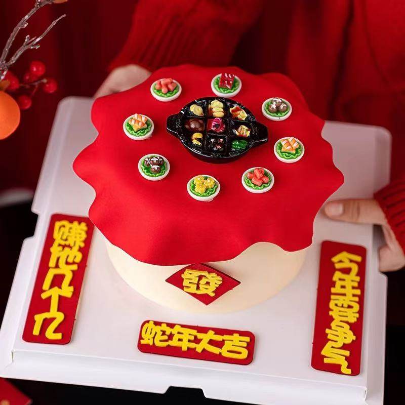 2025春节年夜饭九宫格火锅蛋糕装饰中国红翻糖干佩斯福字贴纸插件