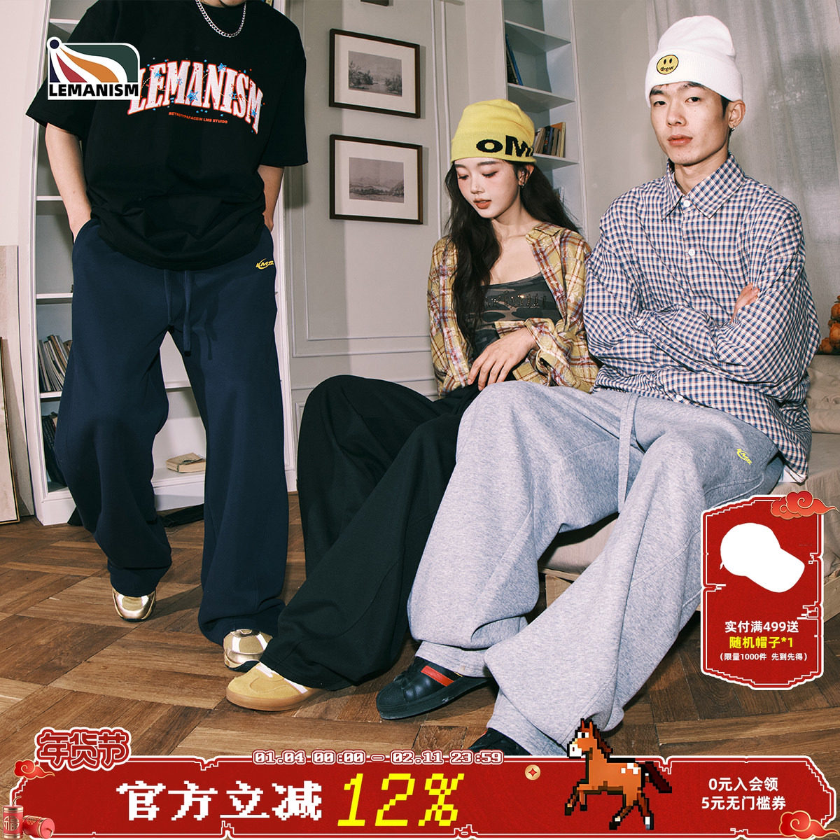 lemanism刺绣加厚加绒卫裤男秋冬休闲裤情侣直筒裤弯刀运动裤子女