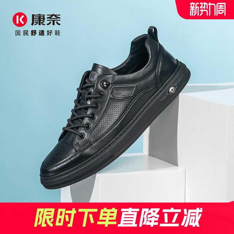 康奈男鞋春秋新款时尚百搭真皮皮鞋男黑色免系带通勤运动休闲板鞋