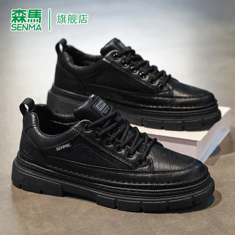 森马男鞋春季新款潮流百搭真皮商务皮鞋男款黑色耐脏系带休闲板鞋