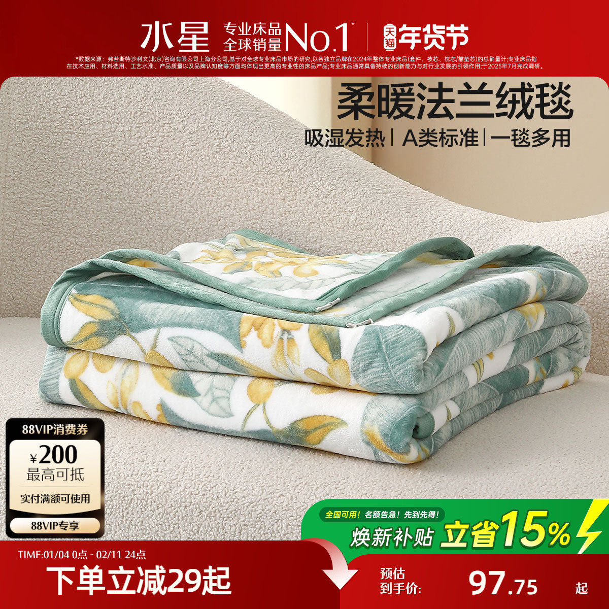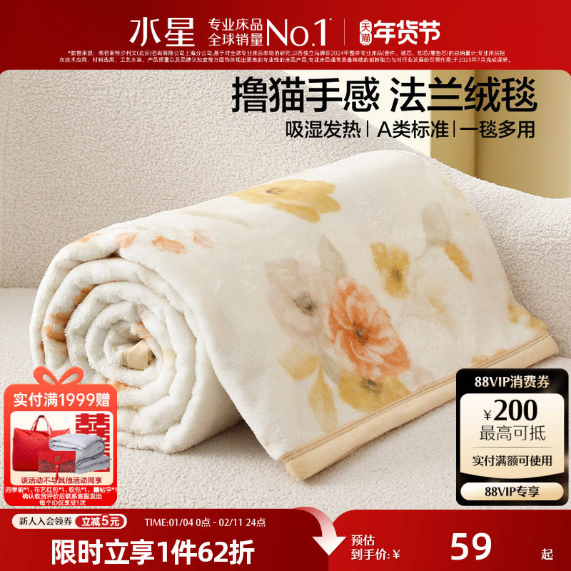 水星家纺法兰绒毯可水洗保暖毛毯办公室午休毯子空调毯床垫毯床品