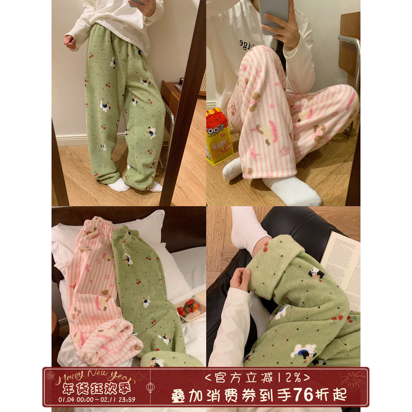 馨帮帮Homedress 秋冬可爱卡通印花毛绒睡裤加厚保暖松紧家居裤女