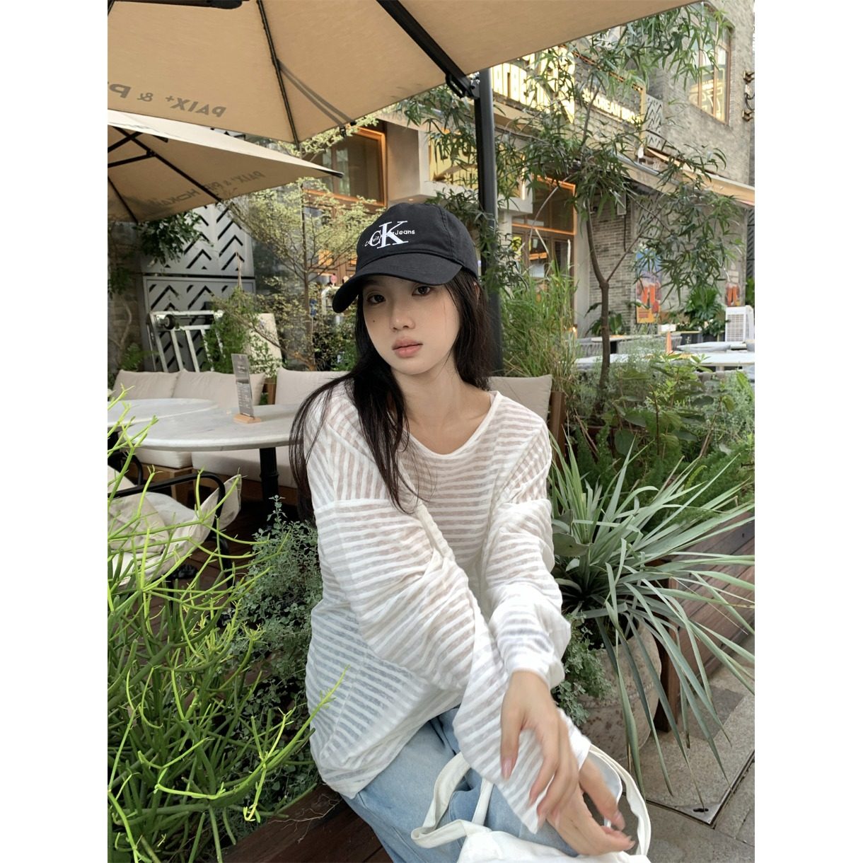 aespa宁艺卓同款韩国seo复古条纹露肩长袖T恤女秋季宽松薄款上衣