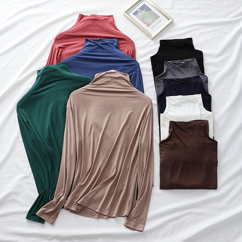 长袖莫代尔打底衫女秋冬半高领内搭T恤纯色秋衣大码宽松薄款上衣