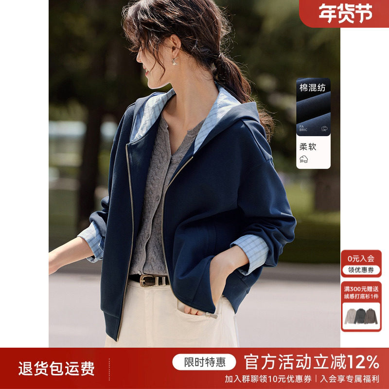 XWI欣未撞色拼接格纹连帽卫衣外套女秋季MIU系知识分子风薄款上衣