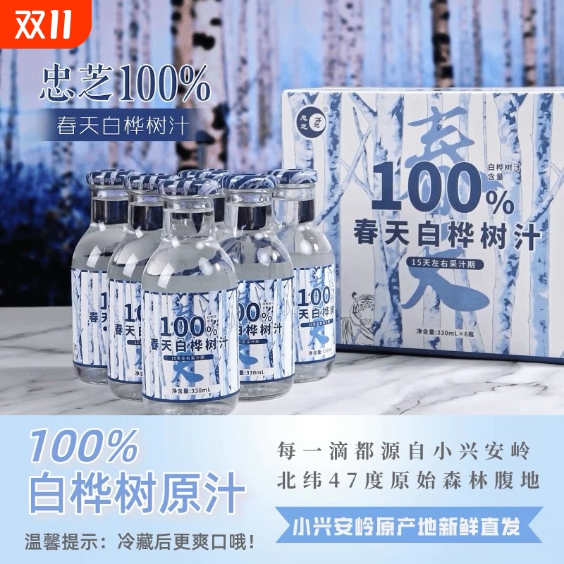 忠芝100%白桦树原汁330ml*6瓶纯天然植物饮料东北特产礼盒装人参